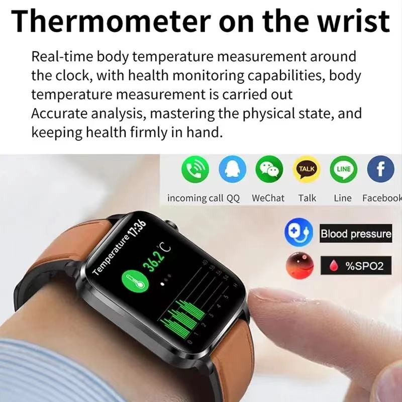 Dual probe laser health therapy, temperature monitoring and warning, independent precise blood oxygen, respiratory rate, heart rate monitoring, blood pressure monitoring, remote care for friends and relatives, 1.70 inch full touch screen, metal alloy enclosure exercise mode, multi-exercise mode, exercise recording.Sleep monitoring, sitting alerts, call and message alerts.