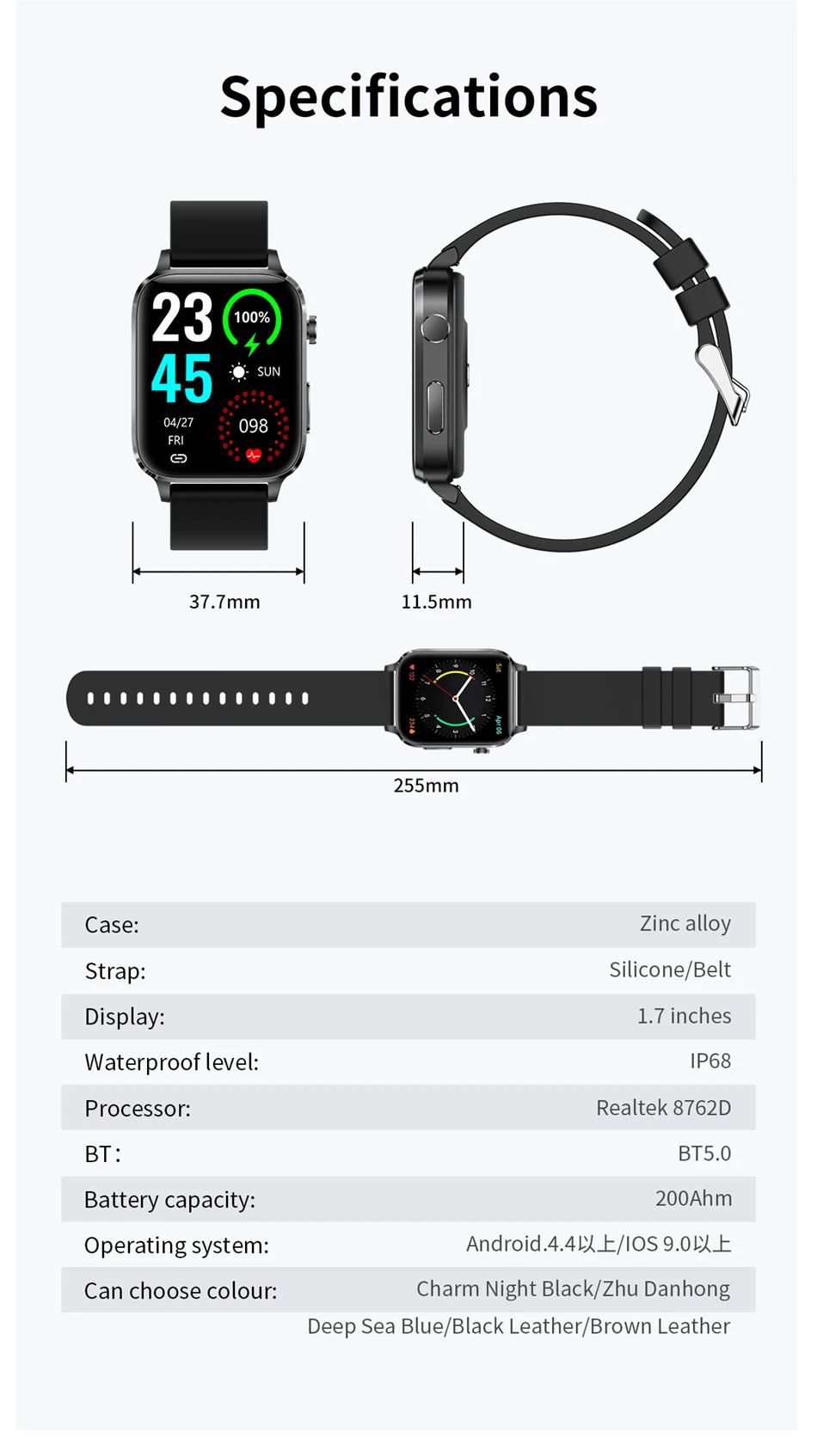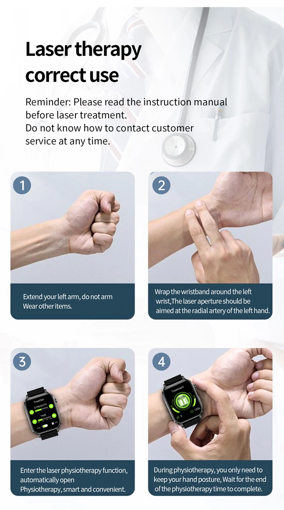 Main Feature:”Laser assisted therapy three high, ultra-low power Realtek 8762DW + 1.70 inch full touch screen, temperature monitoring, blood oxygen monitoring, respiration rate.