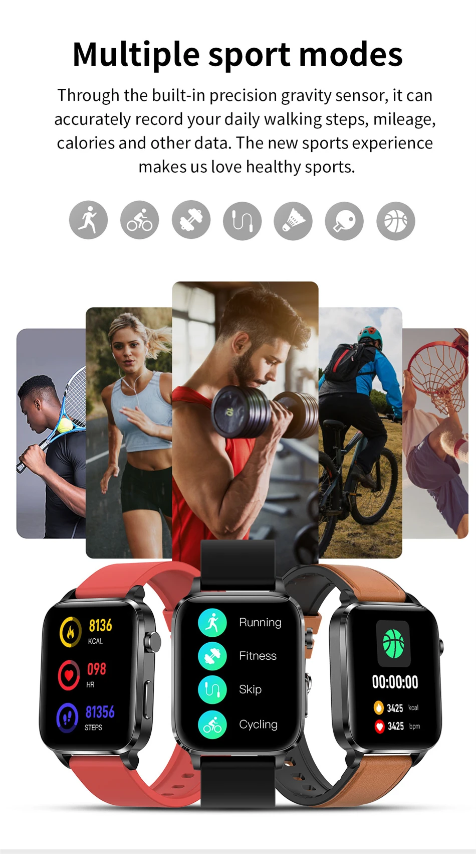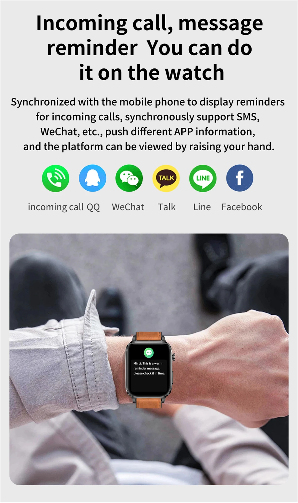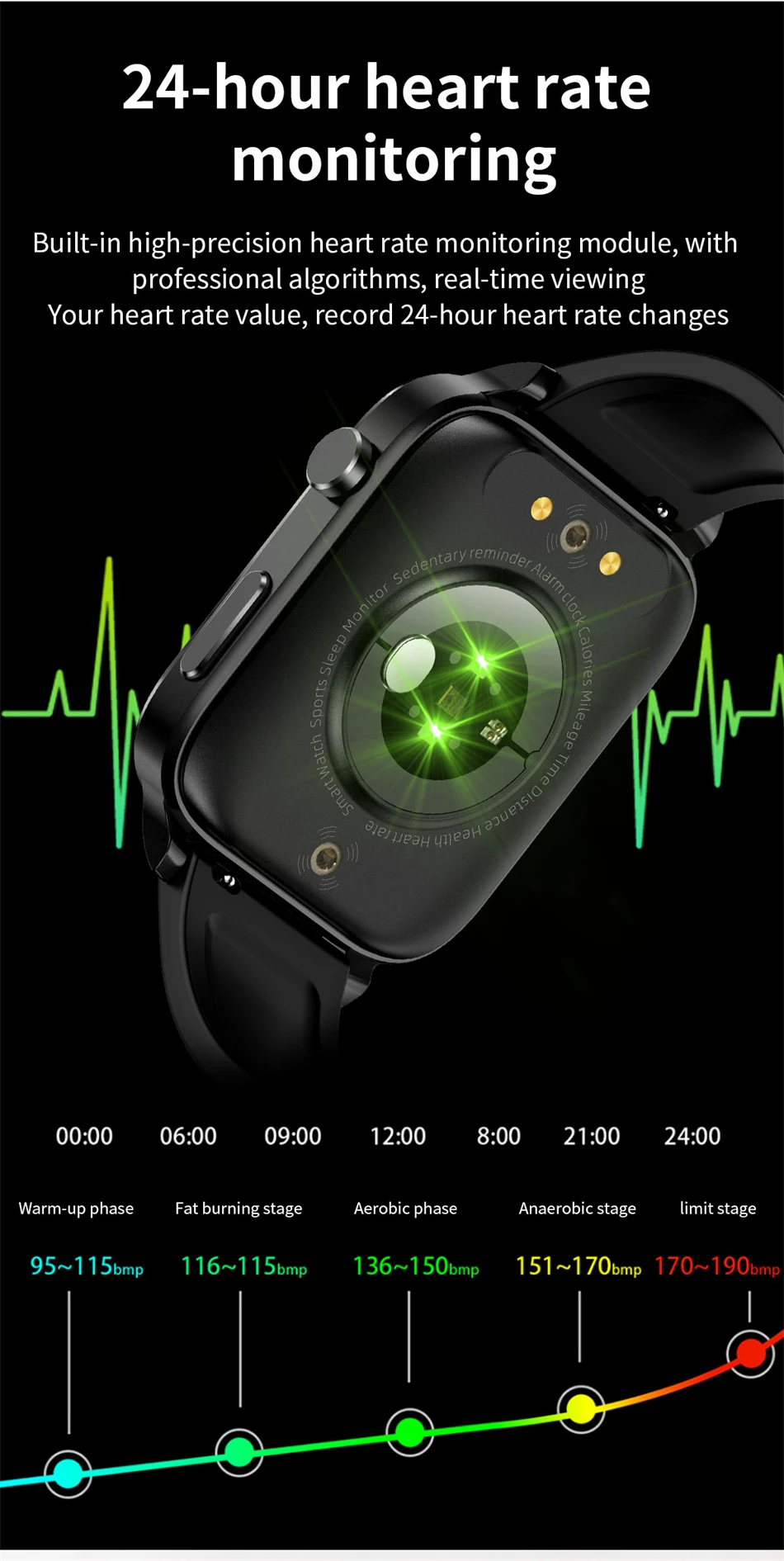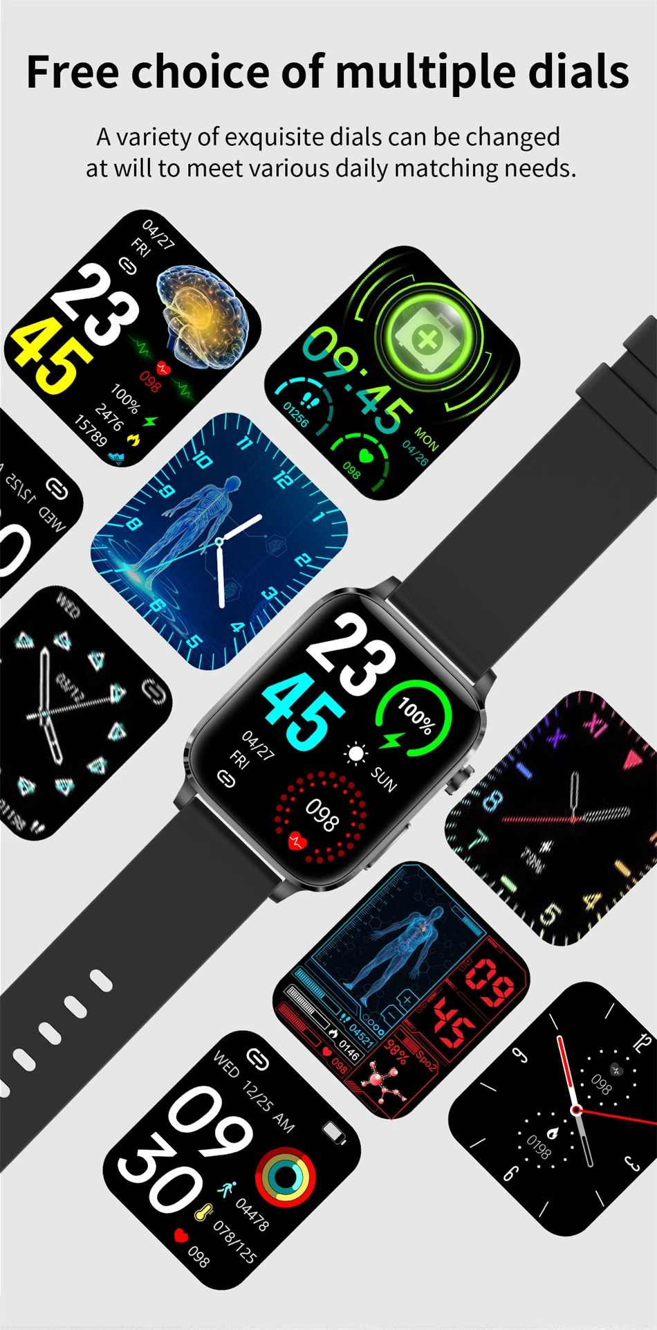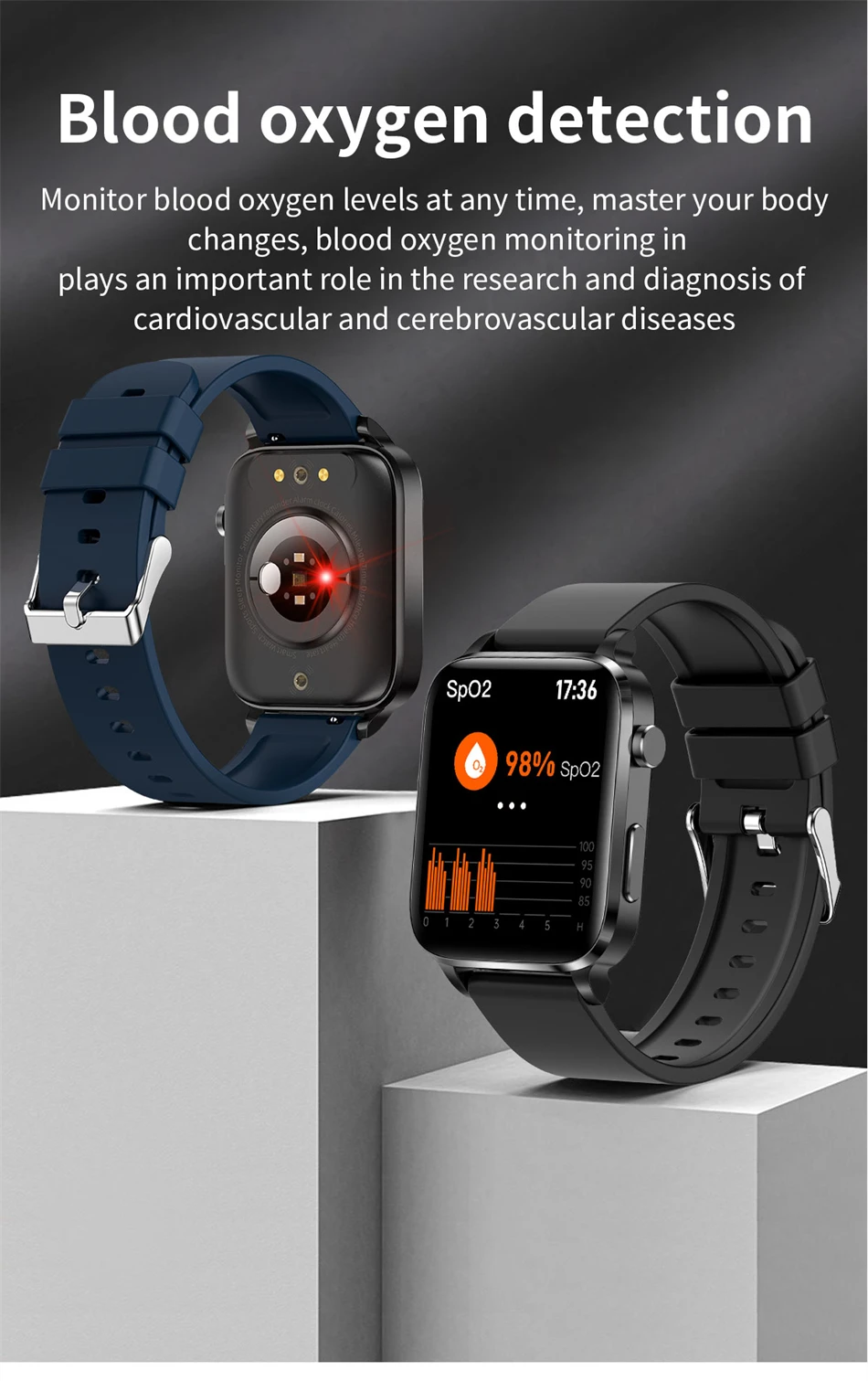 Dual probe laser health therapy, temperature monitoring and warning, independent precise blood oxygen, respiratory rate, heart rate monitoring, blood pressure monitoring, remote care for friends and relatives, 1.70 inch full touch screen, metal alloy enclosure exercise mode, multi-exercise mode, exercise recording.Sleep monitoring, sitting alerts, call and message alerts.