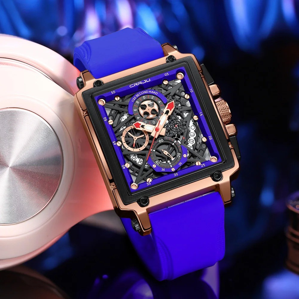 luminous, atuo dat, chronograph(1/10 seconds dial, seconds dial, minute dial), silicone strap, square large dial,waterproof 3 ATM
