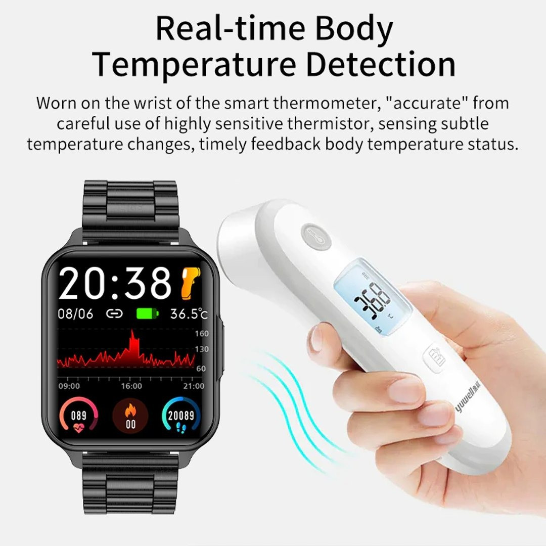 body temperature detectionBIood oxygen saturation24h Heart rate monitoringBlood pressure testDeep waterproofClassic operating modeTrend on the wrist