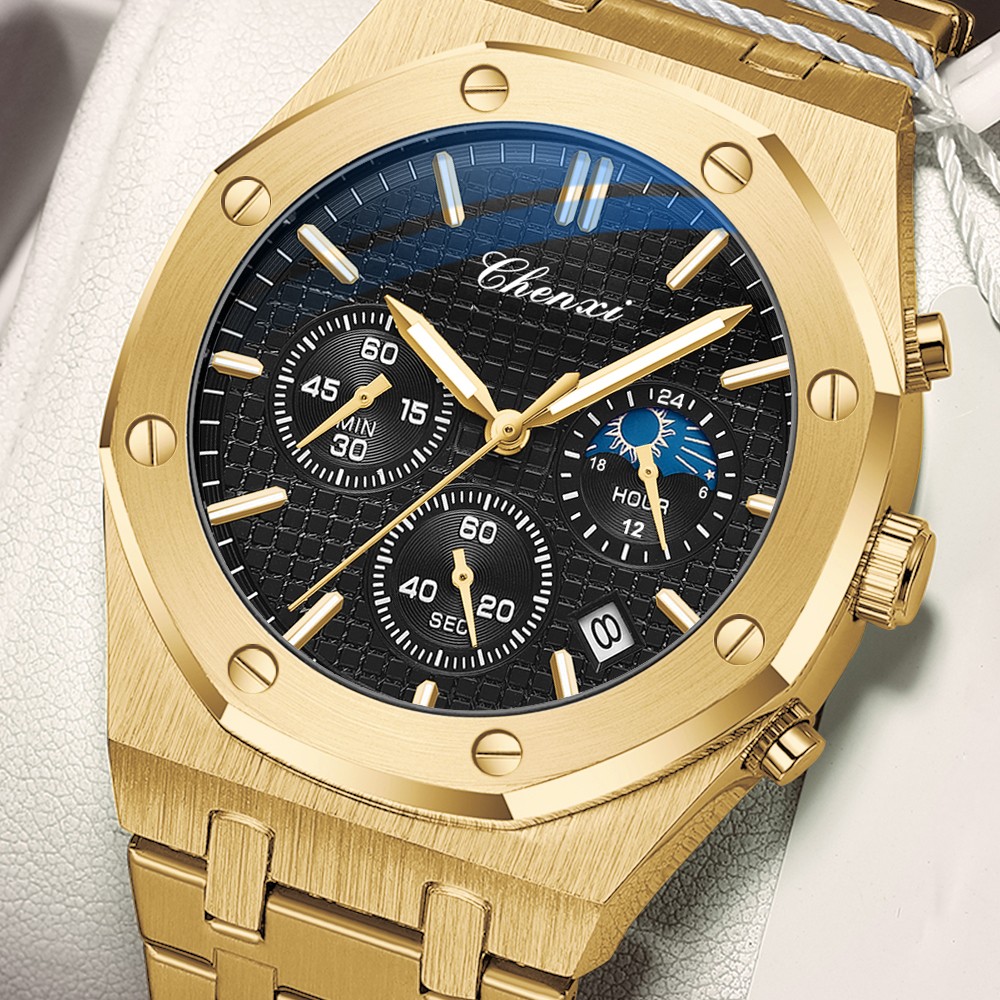 Luxury Gold Watches for Men Royal Stainless Steel Waterproof Chronograph Golden Business Casual Male Quartz Wristwatch